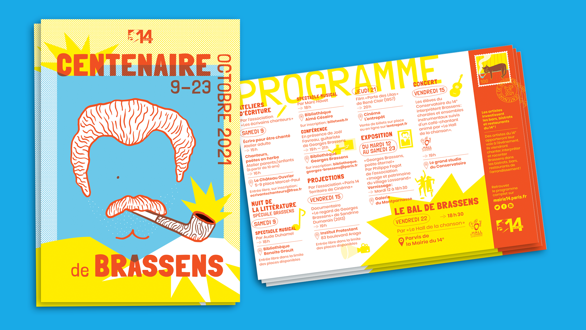 Affiche et programme du Centenaire de Georges Brassens organisé par la Mairie du 14e dans l’arrondissement.